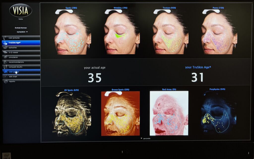 This part was really cool. They did a VISIA scan to estimate how old my skin looked compared to my actual age. It measured things like wrinkles, sun spots, pores, and texture, then compared my skin to a large database of people my age.